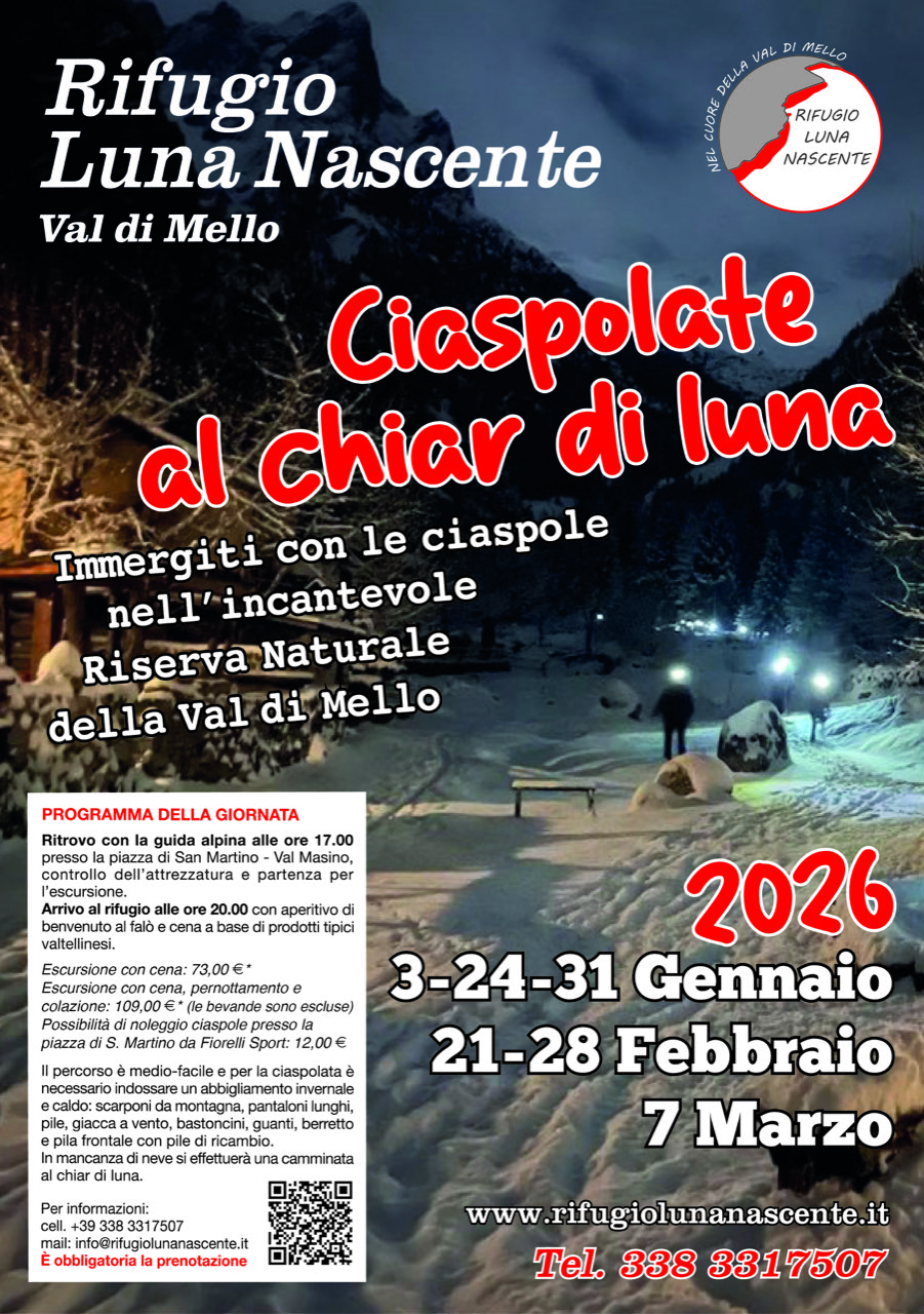 Programma ciaspolate in Val di Mello al chiar di luna per l'inverno 2025-2026
